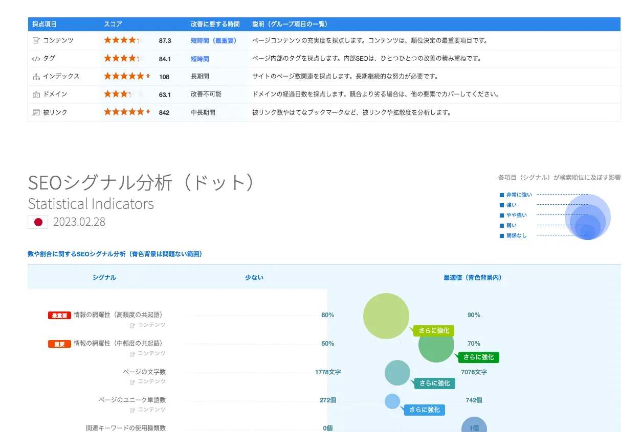 SEOツールを使用して対策キーワードやウェブサイトを分析します。この分析レポートから、どのような改善が必要かを明確にし、上位表示するためのアドバイスと実施します。